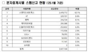 1월 스팸 문자 대량 발송 사업자 '스탠다드네트웍스' 압도적 1위