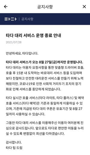 타다, 대리운전 서비스 종료...출범 10개월만