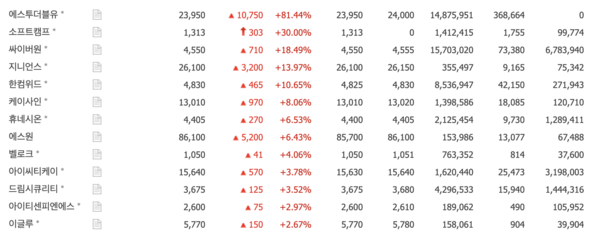 한편 앞선 기업들 외에도 한글과컴퓨터 보안 계열 자회사 한컴위드가 10%대 주가 상승률을 보이며 수혜주로 꼽혔다. 케이사인과 휴네시온도 6~8%대 상승률로 장을 마쳤다.
